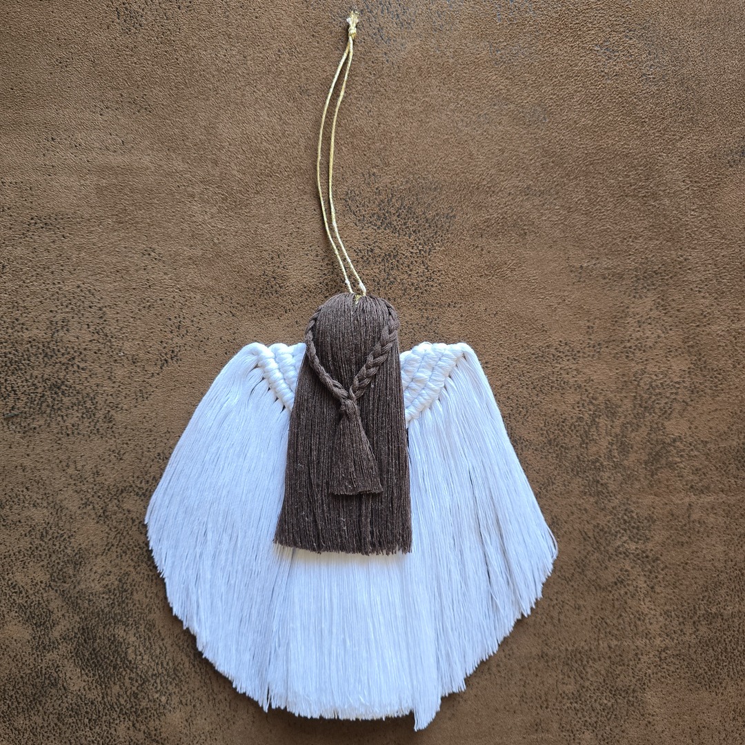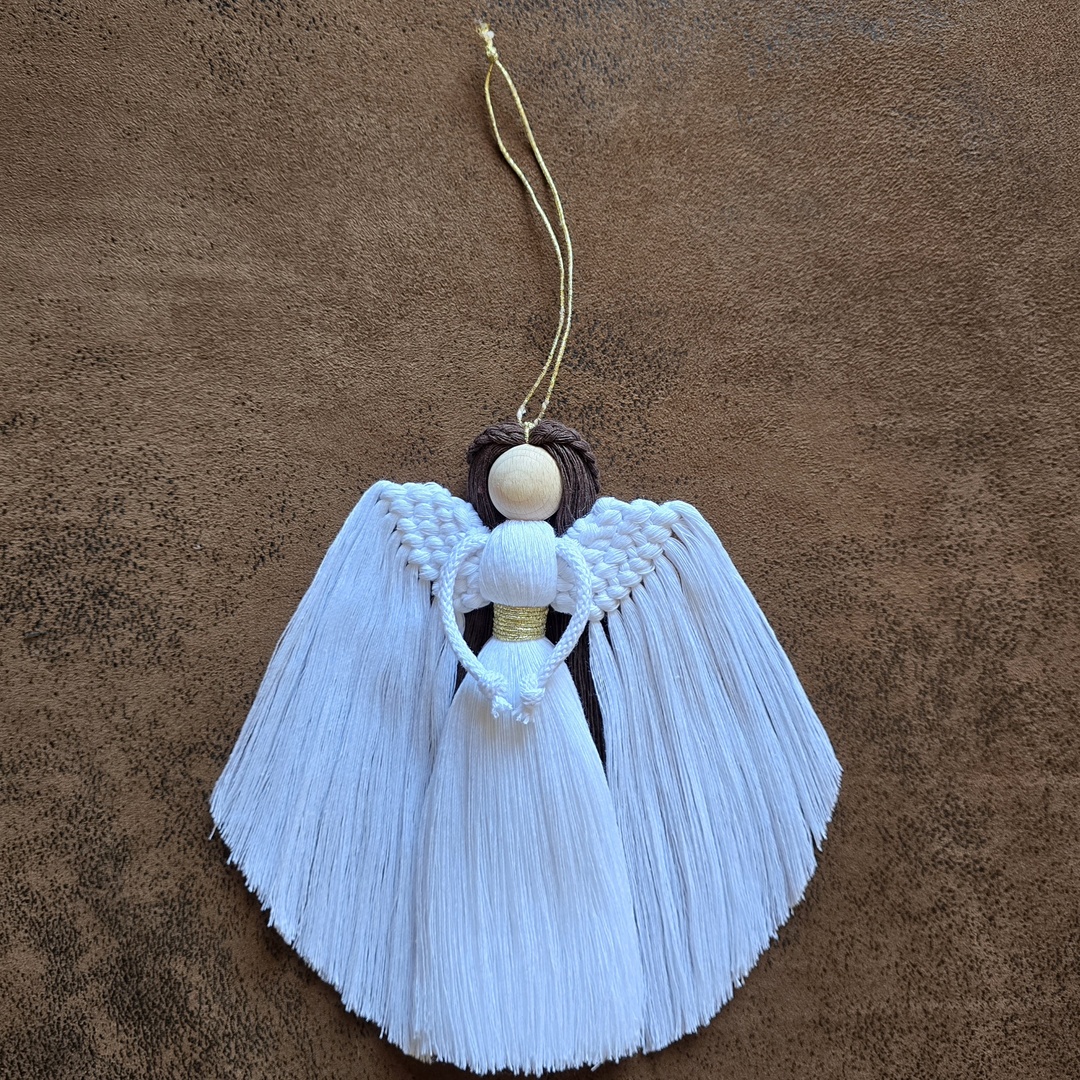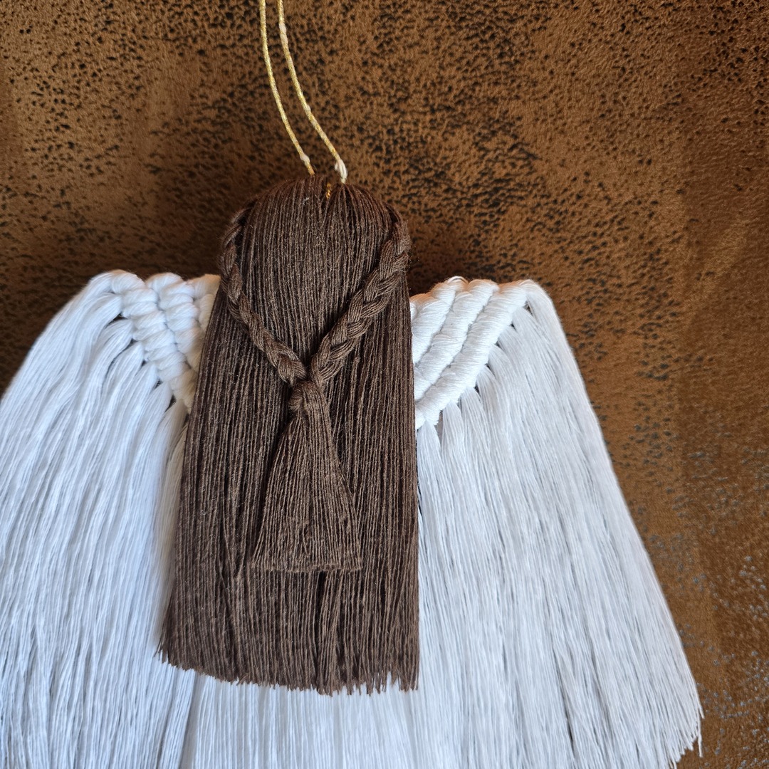 Anioł został starannie wypleciony z miękkiego, bawełnianego sznurka w kolorze czystej bieli🤍 Jego delikatną talię zdobi subtelny pasek ze złotej nitki, który dodaje całości elegancji i lekko połyskuje w świetle. Całość dopełniają włosy w głębokim, ciemnym brązie🤎które pięknie kontrastują z jasnymi skrzydłami.