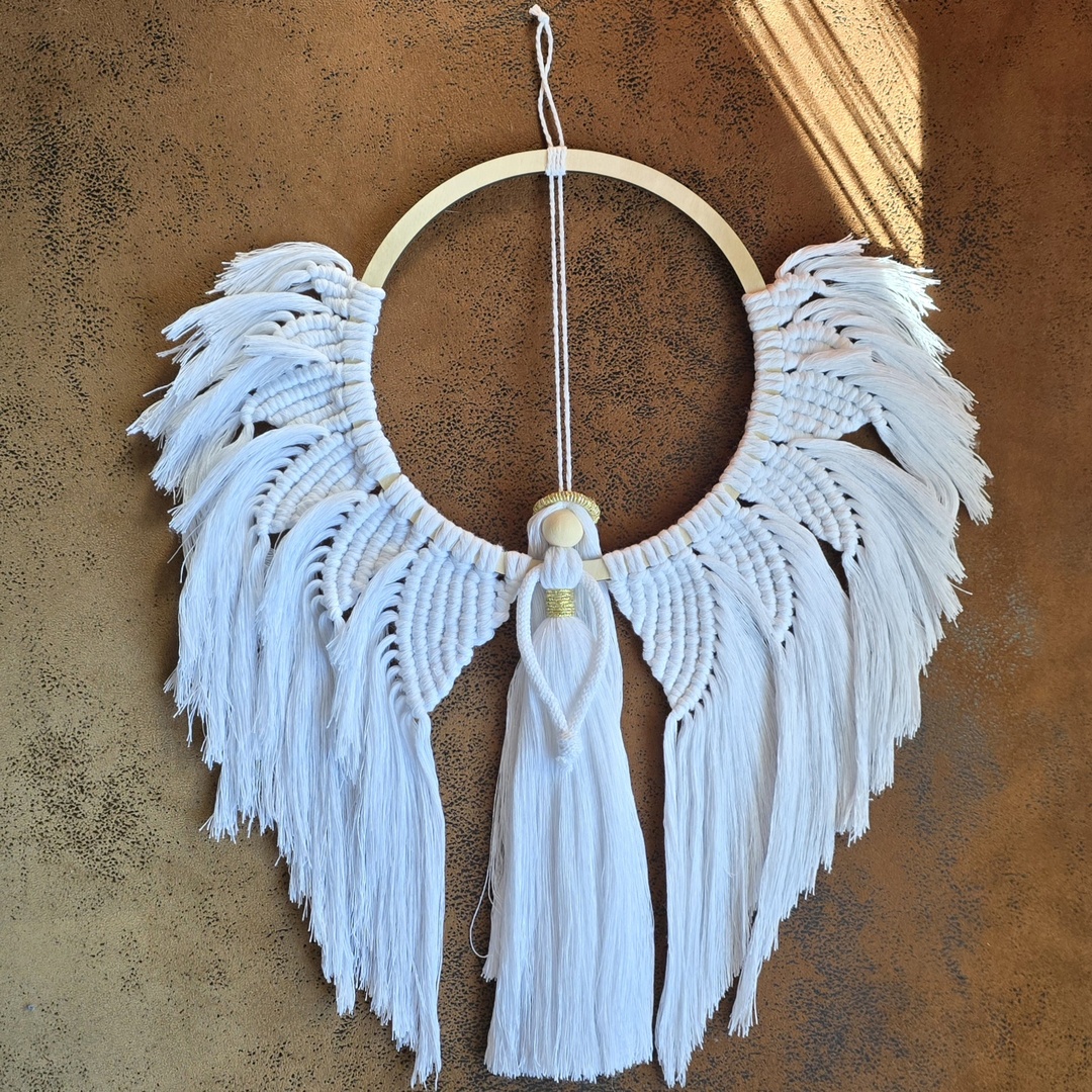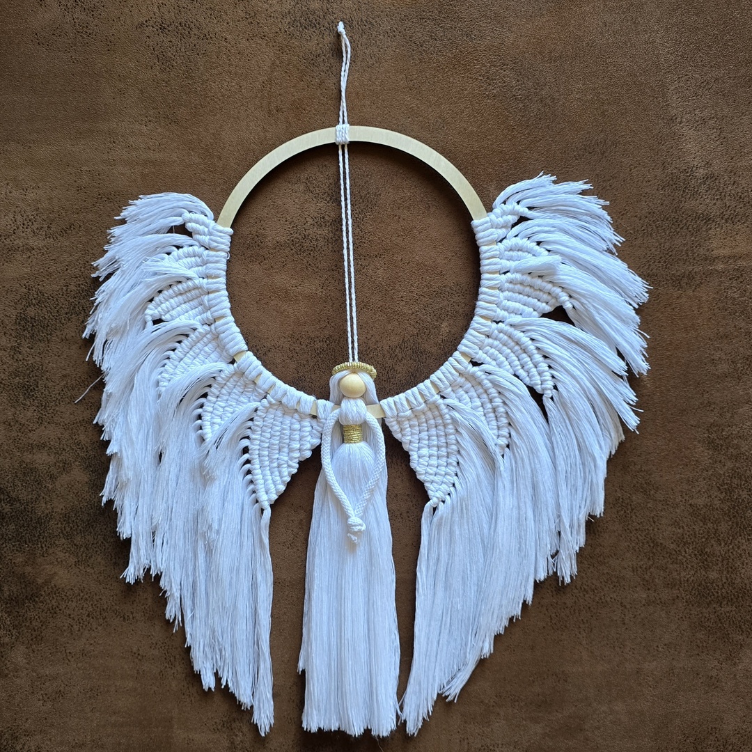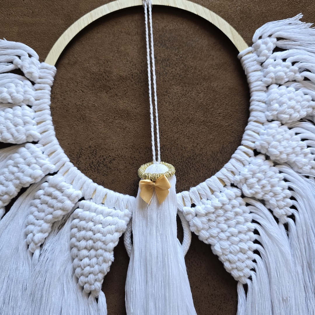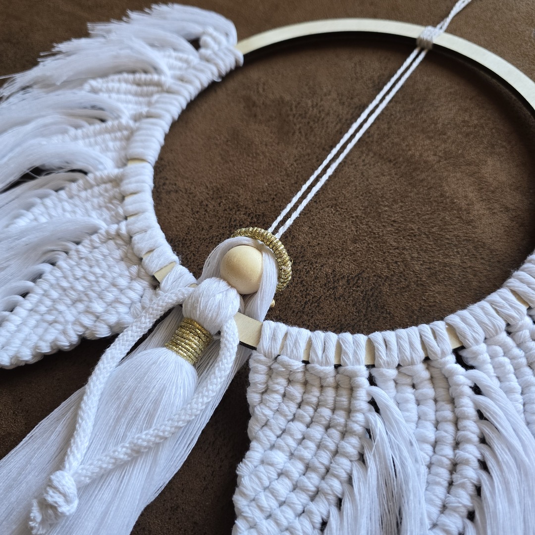 Ręcznie wykonana makrama anioła na drewnianej obręczy to wyjątkowa dekoracja, która wnosi do wnętrza ciepło i harmonię🕊️